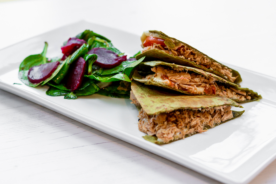 2. On a chopping board lay the spinach wrap, layer the tuna, tomato, and cheddar. Sprinkle the ras el hanout evenly and season with salt and pepper.